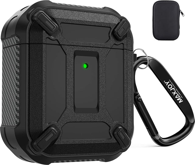 - Maxjoy AIRPODS CASE ACCESSORIES - Package include: 1 * AirPods Rugged Protective Case for AirPods Charging Case 2 & 1 , 1 * Black Metal Carabiner Keychain, 1 * AirPods Pro Storage Bag. Please kindly note AirPods and AirPods charging case are not included