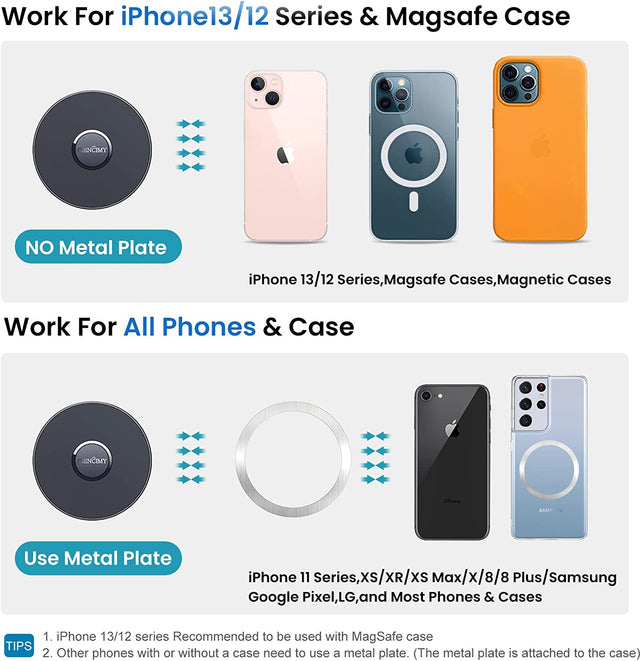 - [Work for All Phones]with metal plate(Package included,Competible with wireless charging), Stick the metal Plate on the phone or case making the mount a universal compatibility.Compatible with iPhone 12/12 Pro Max/12 Pro/12 Mini/12/11 Pro Max/11 Pro/11 /iPhone 8/SE/Xs Max/XS/XR, Samsung Galaxy Note 20/S20 Ultra 5G/20+, LG, Sony,Almost all cell phones.