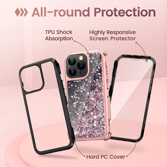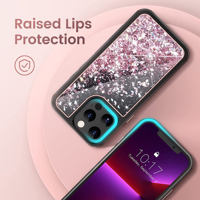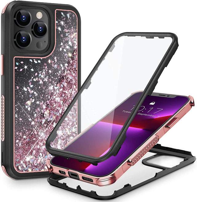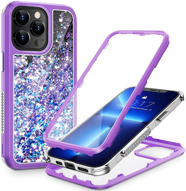- [Compatible Phone Model] Glitter full body case for iPhone 13 Pro Max (6.7 inch, 2021 Release), will NOT FIT other phone models.] The liquid is WHITE MINERAL OIL, which is harmless to our skin. A proper installation of this product is key to a successful protection, so please follow the user manual before each use.