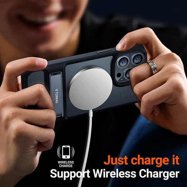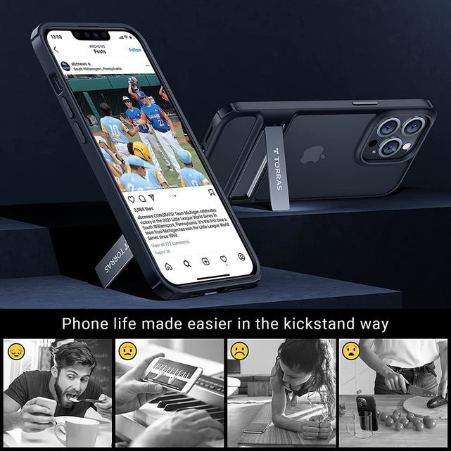 • [Free Your Hands, Enjoy Every Moment] Integrate TORRAS classical shockproof iPhone 13 pro max case and metal kickstand which makes it nice to be able to view YouTube/ Movie/ Skype and PowerPoint when you need. The High-quality aluminum alloy stand can be used more than 30,000 times, snaps in and out easily, clicks into place.