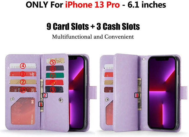 - [Multi-Functional Wallet Design] This wallet case for iPhone 13 Pro Max with 9 card slots (with photo window slot) and 2 long interior cash slot pockets to conveniently hold many cards, cash, money, bills, receipts or some changes when go outside; with a removable short lanyard for more safty carry this wallet case; Definitely a great buy for who likes wallet design phone case