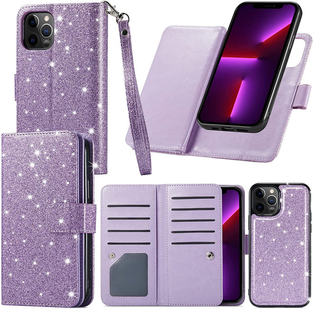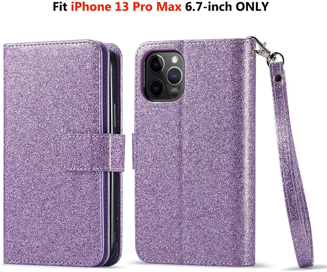 - [Upgraded Version Secures Tighter & Fully Close] iPhone 13 Pro Max case for women made of premium sparkly PU leather lanyard purse clutch with inner removable magnet adsorption TPU case; Improved edition with stronger magnetic clasp to hold phone and cards in a closed position, don't need to worry the phone will slip out or the wallet will not close properly.