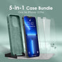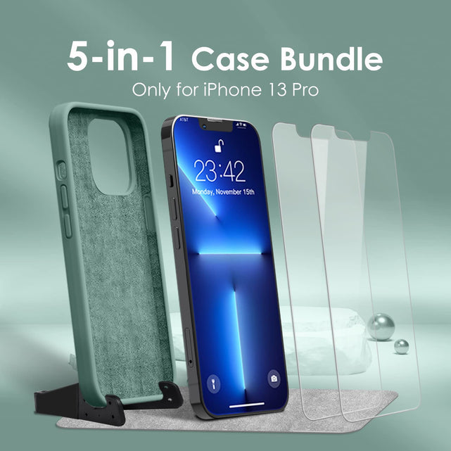 • 【5 in 1 iPhone 13 Pro Case Bundle】With 2 pack hardness tempered glass screen protector, maintaining 99.9% response sensitivity and protect screen from accidental drops & scratches; A large recyclable wiping cloth to easily remove oil stains, fingerprints and dust from the phone screen; A foldable phone stand to allow hands-free TV movies watching experience.