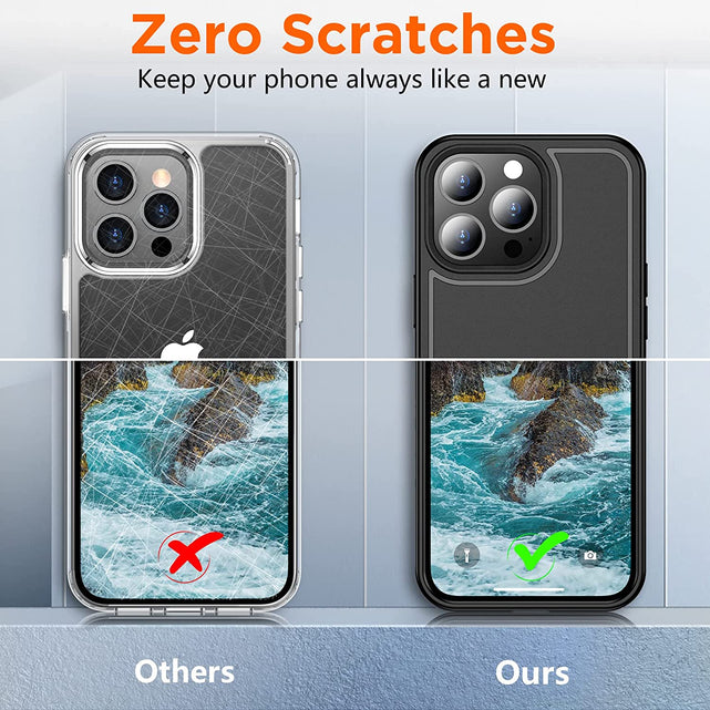 • [Military Grade Drop Protection] iPhone 14 Pro Max case composed of Hard PC back, a flexible TPU frame and 4 shock-absorbent rubber cushions, protect against 6.6ft drops. 1.5 mm raised lips prevent your phone's screen and camera from rubbing against flat surfaces and scratched.