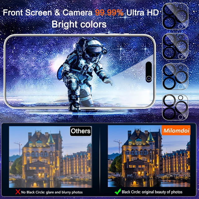Case Friendly & Camera Protector: We care about every detail, This 4 pack camera and 4 pack privacy protector designed to be suitable for 99.99% cases. Milomdoi's lens protector made of 9H+ glass effectively protect entire lens from scratches, drops and not easy to fall off. Special designed black circle perfectly supports night shooting function, clearly capture every moment, without distortion or obstruction, completely maintain the original beauty of photos and videos.