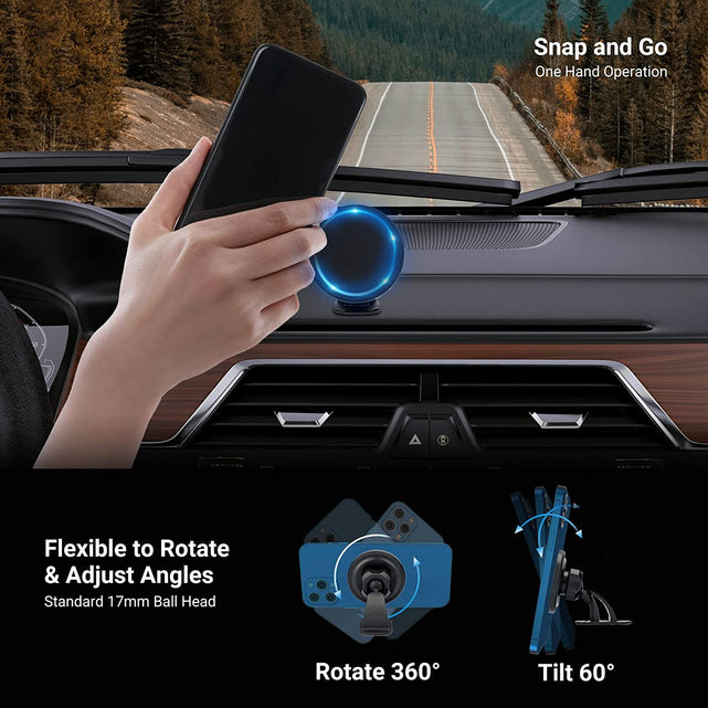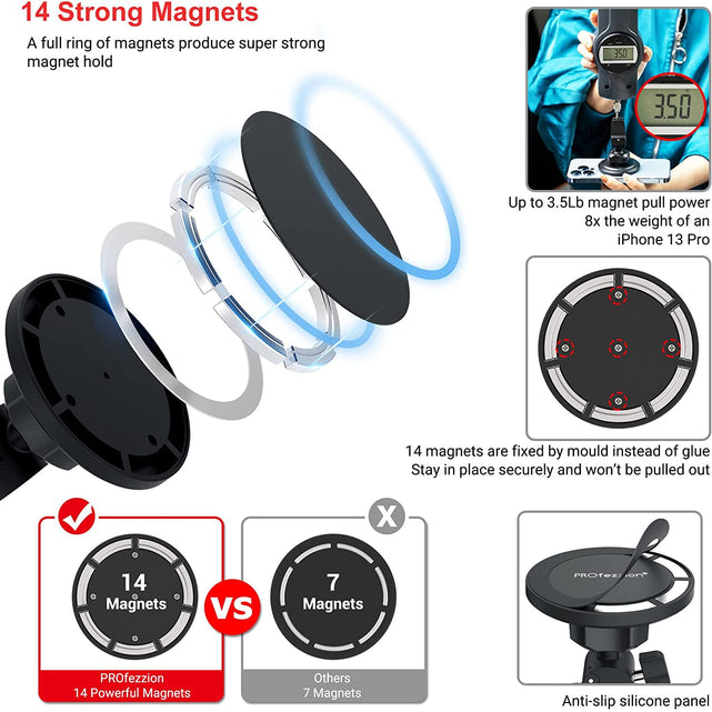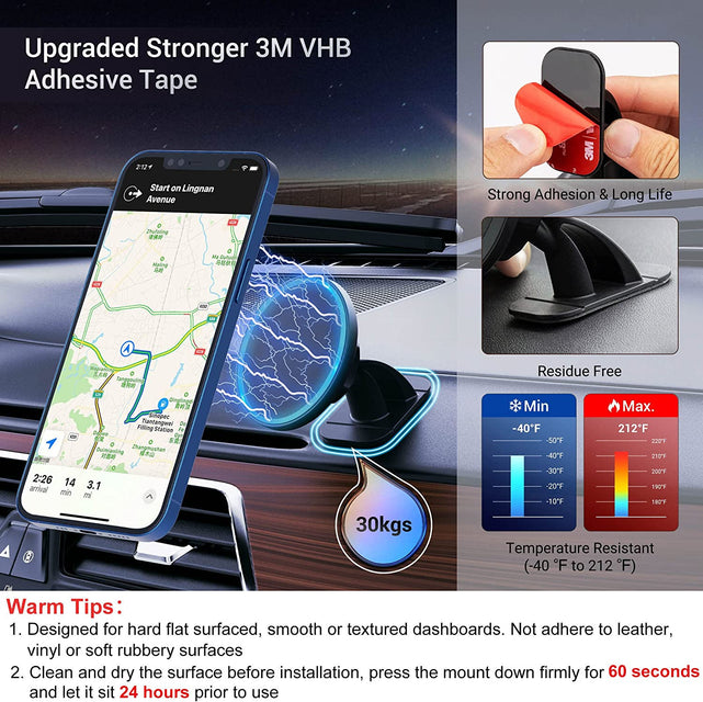 - 【Super Strong Magnetic Attachment】With 14 powerful rare-earth magnets inside, this mount easily and securely holds your phone, no worrying of dropping your phone, even through bumps, sharp turns or sudden stops when mounted on the car dash.