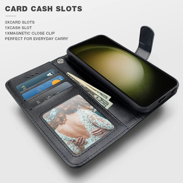 WALLET FEATURES for Galaxy S23 Plus Case - Includes essential slots for your photos, cards, and cash! 3 Card Holder + 1 cash slot and a strong magnetic closure clip for extra security and hold.