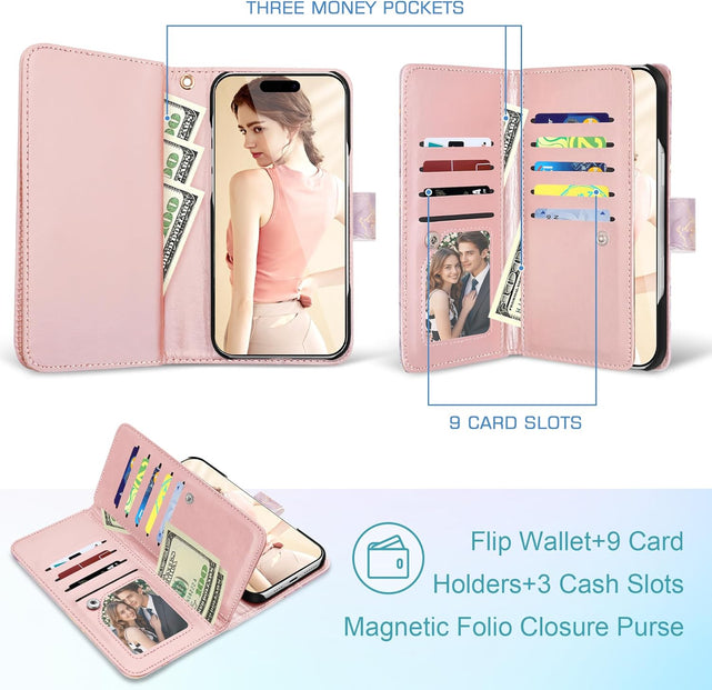 【9 Card Slots & Detachable Wrist Strap】 Inside features 9 card slots,one ID window and 3 bill compartments;Wrist strap is convenient to take your phone to anywhere