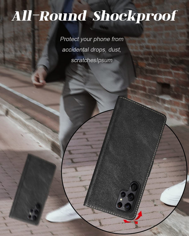 - 👍[Premium PU Leather]-Galaxy S22 ultra case made with Premium PU Leather,durable and fine sewing;Flexible durable soft TPU inner case provides a great dual-layer protection for your devive so as to protect your phone against scratches, bumps, shocks, dirt, daily wear and tear.