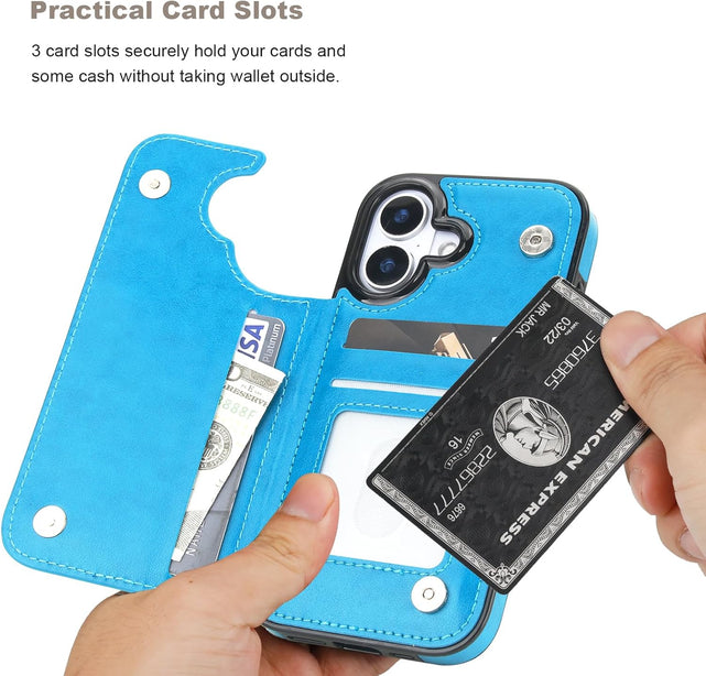 PRACTICAL CARD HOLDER: 4 card slots securely hold your cards and some cash without taking wallet outside.A strong double Magnetic buckled tightly holds the cards in and does not pop open.