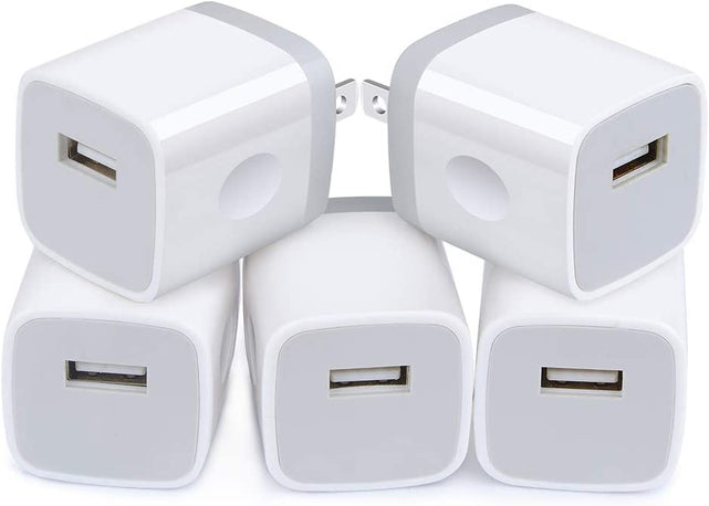 - What You Get: 5-Pack Single USB A Chager Power adapter ( Puer White ) is best gift ,you can share it with your friends or family ,enjoy freedom charging at anywhere ,very convenient for you to plug in the Lightning charging cable (or usb c/micro )to your iphone or android phone,and other usb device