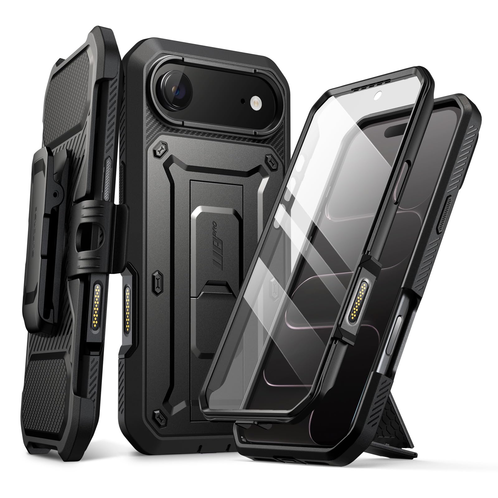 - This iPhone 17 Pro Max phone case includes a detachable 360° belt clip. The fully rotating holster provides hands-free convenience, while secure side clasps let you snap the case on and off effortlessly. Ready for work, travel, and outdoor adventures.