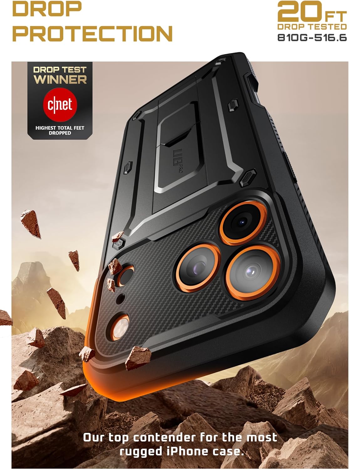 - Engineered for Ultimate Defense: Survives drops up to 20 ft (6 m) with military-grade impact resistance (MIL-STD-810H-516.6 certified). Built with a hybrid TPU + PC frame, reinforced corner airbags, and a PET built-in screen protector. Precision-raised edges (1.5 mm camera lip, 2 mm screen lip) and an ultra-slim ~3.94 mm back profile keep your device safe. Includes an additional TPU guard designed to protect the iPhone 17 Pro Max camera array.